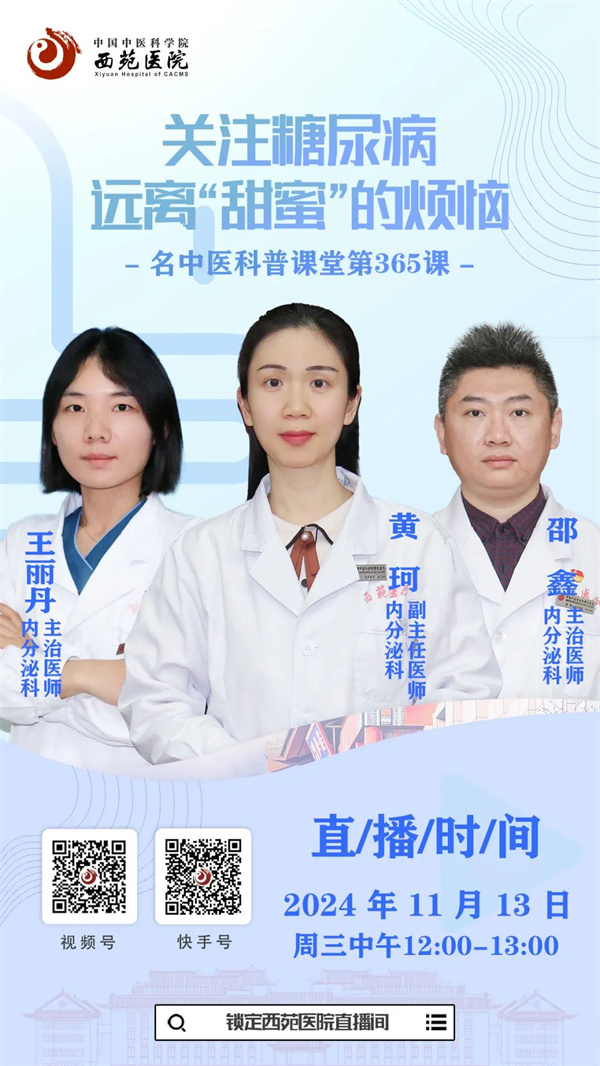 11月13日中午12點(diǎn),西苑醫(yī)院內(nèi)分泌科副主任醫(yī)師黃珂、主治醫(yī)師邵鑫、主治醫(yī)師王麗丹講解:關(guān)注糖尿病,遠(yuǎn)離“甜蜜”的煩惱。歡迎您預(yù)約并準(zhǔn)時(shí)收看直播。