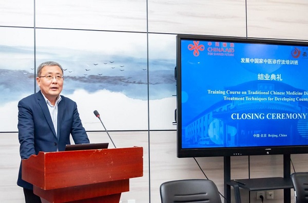 On December 20, 2023, the training course on TCM diagnosis and treatment for developing countries sponsored by the Ministry of Commerce and undertaken by Xiyuan Hospital of China Academy of Chinese Medical Sciences was successfully concluded. Zhang Yunling, Secretary of the Party Committee of Xiyuan Hospital attended the closing ceremony and delivered a speech. Mr. SALAM ARSLAN AHMED, a health officer from the National Health Centre of Pakistan, and Mr. BEN AMARA MOHAMED KHALIL, Senior Traditional Physician of the Tunisian Society of Traditional Chinese Medicine, spoke as student representatives, Fu Jianhua, director of Xiyuan Hospital Administration Office, presided over the meeting.
