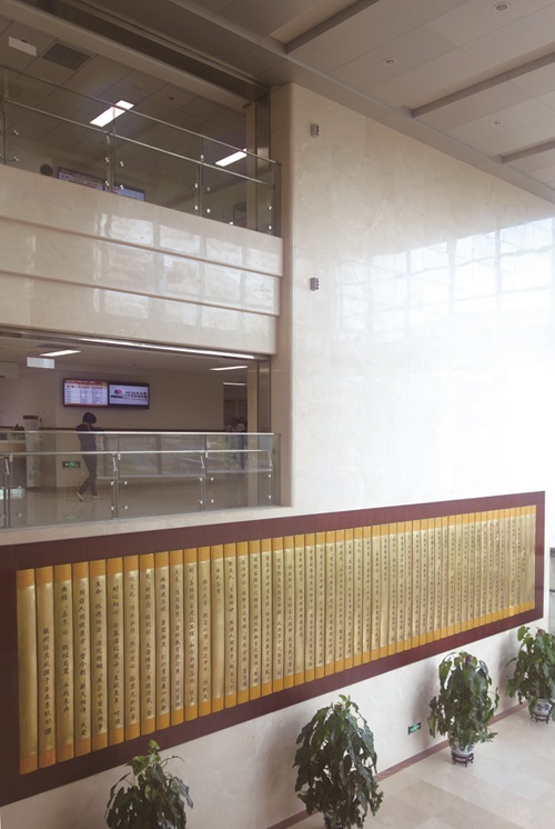 The author of Xiyuan Hospital Ode is Professor Zhang Qicheng from School of Management, Beijing University of Chinese Medicine. The Ode has eight paragraphs with a total of 893 words, which fully demonstrates the history, human geography, cultural heritage and brilliant achievements of Xiyuan Hospital. The words therein are simple and elegant, and the whole article is magnifi-cent, vividly showing the spirits of Xiyuan Hospital. The Bronze Slips in Xiyuan Hospital were built by China Architectural Culture Center. The works are 11.5 meters long and 2.5 meters wide, with 20 cm antique ornamentation on the side. The characters engraved adopt classic Wei rubbing font in the original complex form, making people feel a strong historical and cultural atmosphere.