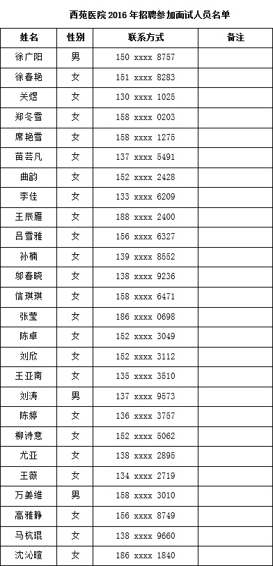 詳見《西苑醫(yī)院2016年招聘面試人員名單》。請名單中人員務(wù)必于3月28日(周一)下午5點之前,將參加面試回執(zhí)回復(fù)至郵箱:xiangguoliang@sina.com?;貓?zhí)格式如同參加筆試回執(zhí)。