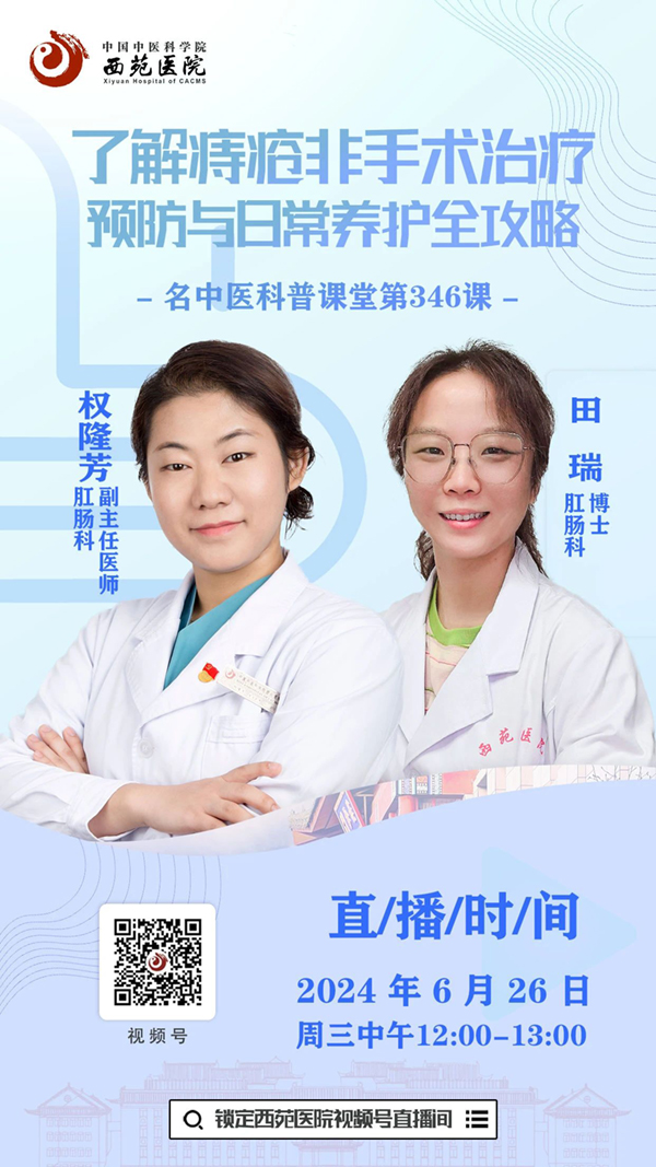 如果您也關(guān)心“菊”部健康,那就一定不要錯過6月26日周三中午12:00,西苑醫(yī)院名中醫(yī)科普課堂第346課。西苑醫(yī)院肛腸科副主任醫(yī)師權(quán)隆芳、田瑞博士將和您一起聊聊痔瘡的“非手術(shù)治療”。您可以通過掃描直播二維碼或點擊直播鏈接,提前預(yù)約并準(zhǔn)時參與直播!