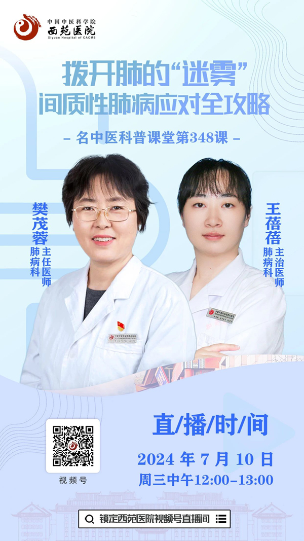 7月10日(周三)中午12點,西苑醫(yī)院肺病科主任醫(yī)師樊茂蓉、主治醫(yī)師王蓓蓓將跟您一起聊聊間質(zhì)性肺病的相關(guān)話題,屆時您也可以與樊茂蓉主任醫(yī)師、王蓓蓓主治醫(yī)師在線互動交流。您可以通過掃描直播二維碼或點擊直播鏈接,提前預(yù)約并準時參與直播!