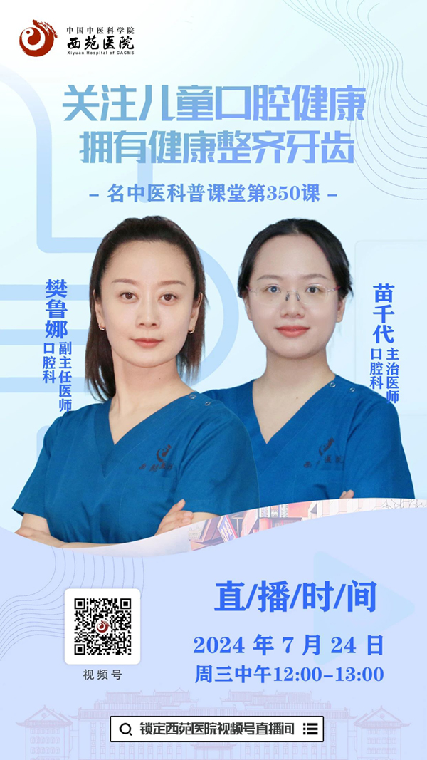 7月24日周三中午12:00,西苑醫(yī)院口腔科樊魯娜副主任醫(yī)師,苗千代主治醫(yī)師將和家長(zhǎng)們聊聊兒童口腔保健,齲病預(yù)防管理和牙齒錯(cuò)頜畸形矯治等方面的相關(guān)知識(shí),屆時(shí)您可以與樊魯娜副主任醫(yī)師、苗千代主治醫(yī)師在線互動(dòng)交流,歡迎您通過(guò)掃描直播二維碼或點(diǎn)擊直播鏈接,提前預(yù)約并準(zhǔn)時(shí)參與直播!