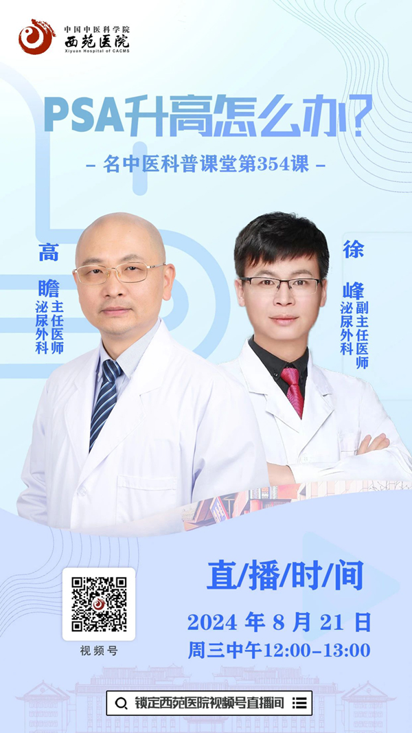 8月21日(周三)中午12:00,西苑醫(yī)院泌尿外科高瞻主任醫(yī)師、徐峰副主任醫(yī)師和您一起聊聊PSA升高該怎么辦?屆時(shí),兩位專家會(huì)詳盡為大家解答一系列PSA升高相關(guān)問(wèn)題。歡迎您預(yù)約并準(zhǔn)時(shí)收看直播!