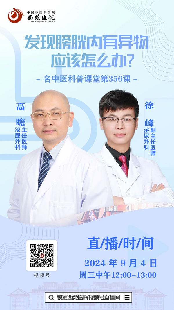 9月4日 周三中午12:00,西苑醫(yī)院泌尿外科腫瘤專(zhuān)家高瞻教授、腫瘤手術(shù)專(zhuān)家徐峰副主任醫(yī)師和您一起聊聊發(fā)現(xiàn)膀胱內(nèi)有異物,應(yīng)該怎么辦?屆時(shí),將詳細(xì)為您介紹膀胱內(nèi)發(fā)現(xiàn)腫瘤的類(lèi)型、分級(jí)、處理方式、目前治療前沿等信息,歡迎您預(yù)約并準(zhǔn)時(shí)收看直播!