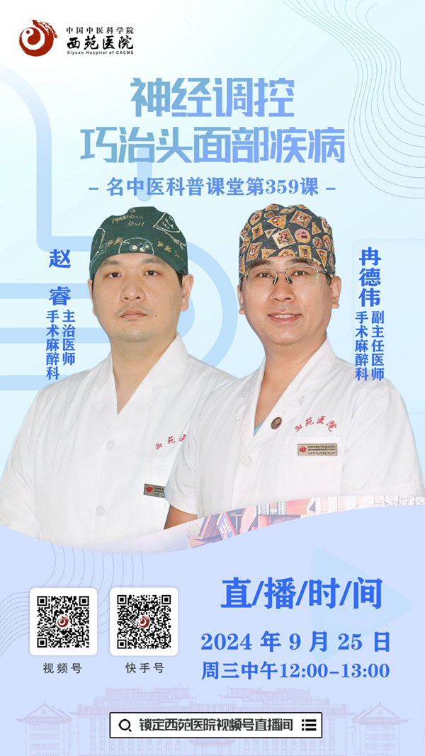 9月25日周三中午12:00,西苑醫(yī)院手術(shù)麻醉科副主任醫(yī)師冉德偉、主治醫(yī)師趙睿將帶來主題科普:神經(jīng)調(diào)控巧治頭面部疾病。和大家一起聊一聊利用中西醫(yī)結(jié)合方式進(jìn)行神經(jīng)調(diào)控治療頭面部疾病的問題,探討最近比較受關(guān)注的“頭痛針” “鼻炎針”,了解交感神經(jīng)及副交感神經(jīng)調(diào)控的方式與方法,敬請關(guān)注西苑醫(yī)院官方直播間。