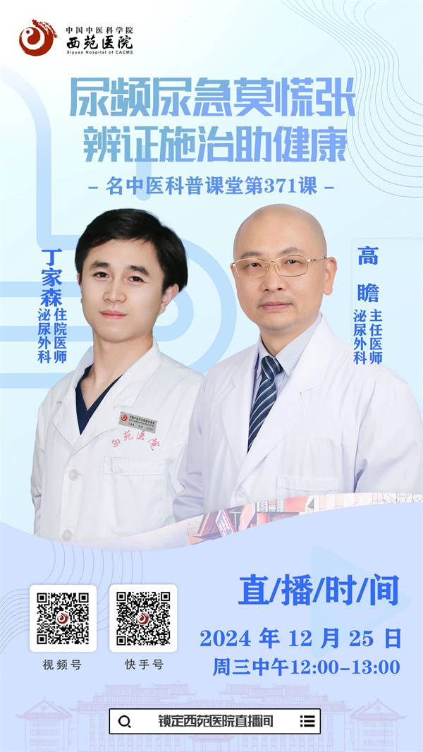 那么什么是尿頻、尿急?哪些原因引起尿頻、尿急?中醫(yī)藥能緩解尿頻、尿急嗎?12月25日周三中午12:00,西苑醫(yī)院泌尿外科高瞻主任醫(yī)師、丁家森醫(yī)師和您一起聊聊尿頻、尿急,應(yīng)該怎么辦?屆時,將為您詳細(xì)介紹尿頻、尿急的表現(xiàn)、治療、中醫(yī)藥干預(yù)、預(yù)防等信息,歡迎您預(yù)約并準(zhǔn)時收看直播!