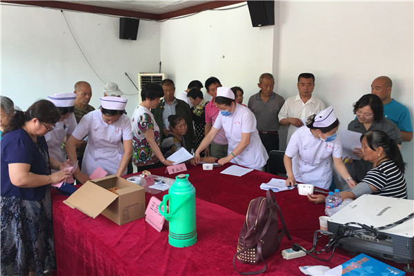 本次活動的內(nèi)容有:醫(yī)學診療、化驗檢查、體質(zhì)辨識、健康咨詢、中醫(yī)技術(shù)體驗、健康資料發(fā)放等。早晨7點30分,熱情高漲的村民們就早已在村委會排起長龍,翹首期盼醫(yī)護人員的到來。護理部委派5名具有豐富臨床經(jīng)驗的護士組成小分隊,早上6點出發(fā)先前到達義診地點,為村民們采集血標本,收集尿標本。護士們精湛的抽血技術(shù)令村民們豎起大拇指,不到1個小時便完成135人次的血液標本采集工作。