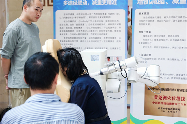 西苑醫(yī)院內(nèi),多個特色活動區(qū)域同步開放,吸引眾多市民參與體驗。在“血脈覺醒”體驗區(qū),耳穴貼壓、頭部刮痧、溫灸刮痧等傳統(tǒng)中醫(yī)護理技術(shù)深受歡迎;“福星 ‘膏’ 照”體驗區(qū),工作人員詳細(xì)講解膏方的組方原理、制作工藝,并提供不同功效的膏方供市民品鑒;“妙手回春”體驗區(qū),藥物面膜、皮膚檢測、頭皮熏蒸、面部刮痧、生發(fā)酊 + 梅花針叩刺等針對皮膚問題的非藥物療法吸引了大量關(guān)注,專業(yè)醫(yī)師為市民提供皮膚健康咨詢與體驗服務(wù),幫助大家了解中醫(yī)藥在皮膚健康管理方面的優(yōu)勢;“生生不息”體驗區(qū),市民可以體驗在服貿(mào)會“爆火”的經(jīng)絡(luò)調(diào)理機器人,專業(yè)醫(yī)師為有體重管理需求的市民提供科學(xué)指導(dǎo),將傳統(tǒng)中醫(yī)理念與現(xiàn)代健康管理相結(jié)合;“杏林拾趣”區(qū)域,充滿中醫(yī)藥元素的文創(chuàng)產(chǎn)品讓人眼前一亮,市民還可以親手調(diào)配具有安神、助眠等功效的香囊,在動手過程中感受中醫(yī)藥文化的趣味與魅力。