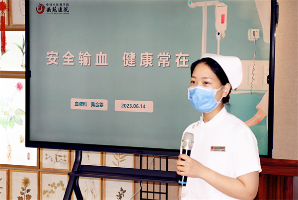 吳合雯主管護師從輸血的目的、原則、輸血指征以及用血安全等方面作介紹,并詳細(xì)講解了目前國內(nèi)臨床常見成分血的種類、適用人群以及輸注安全等,并指導(dǎo)患者正確按壓穿刺點的方法。
